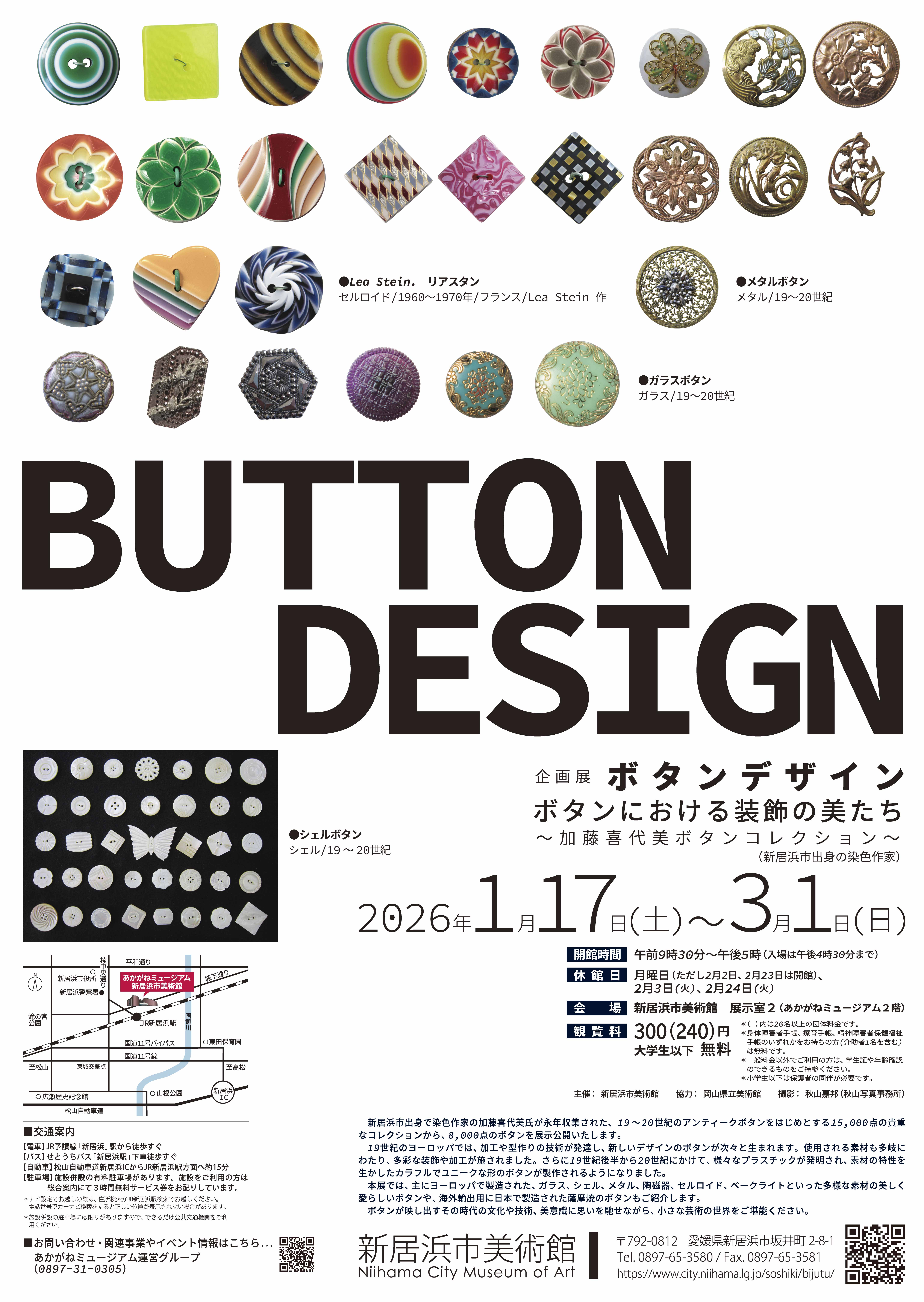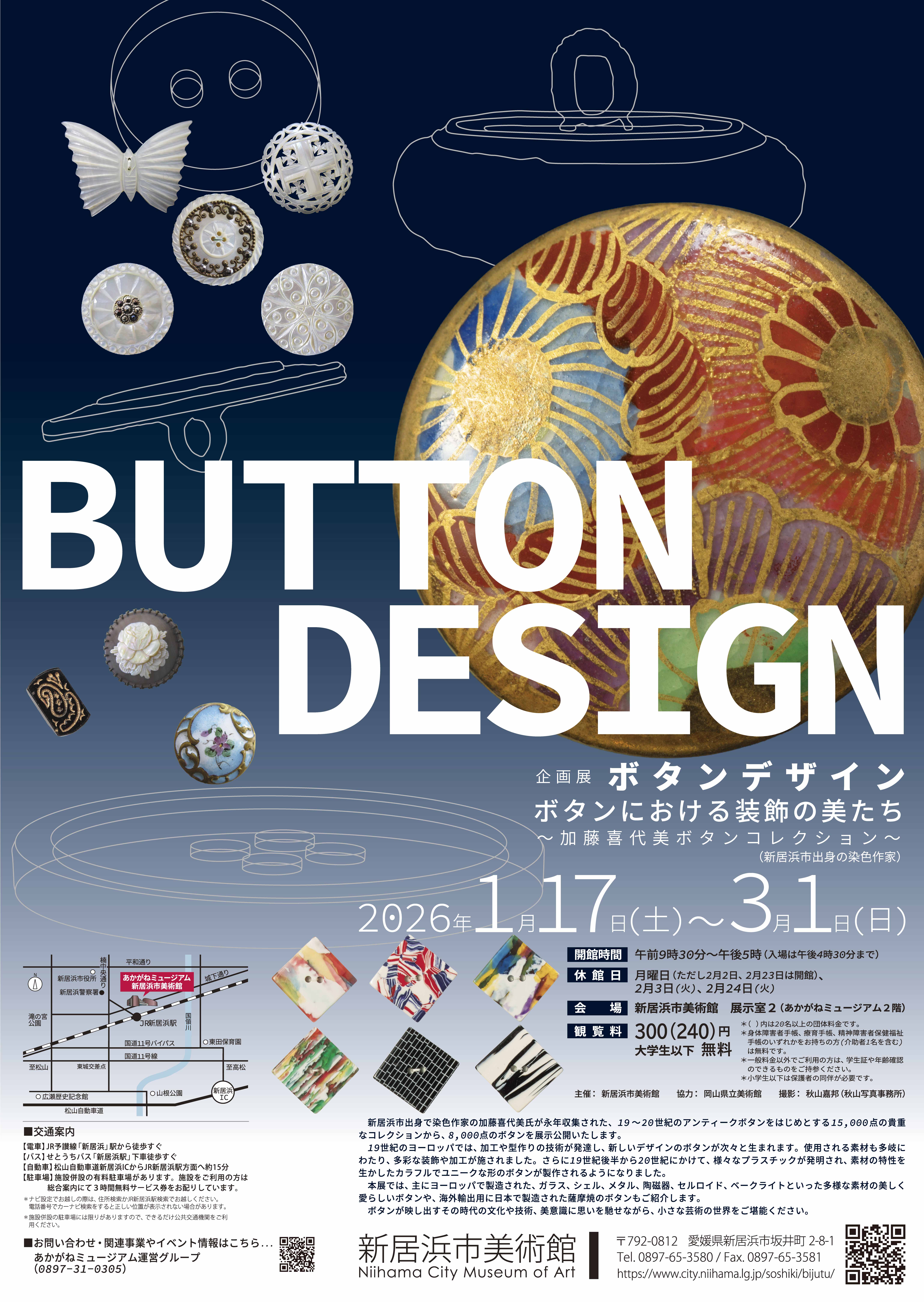 新居浜市出身で染色作家の加藤喜代美氏が永年収集された、19~20世紀のアンティークボタンをはじめとする15,000点の貴重なコレクションから、8,000点のボタンを展示公開いたします。