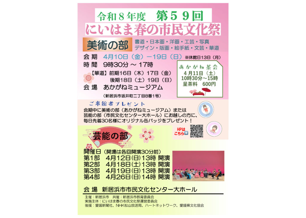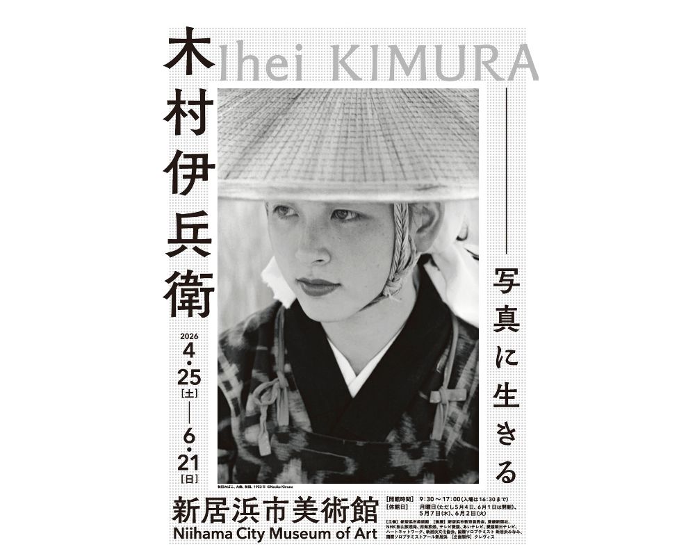 Niihama City Museum of Art 新居浜市美術館 新居浜市美術館からのお知らせ 開催中の展覧会 過去の展覧会アーカイブ 新居浜市美術館からのお知らせ 2026.04.08 新居浜市美術館 令和8年度春季特別展 木村伊兵衛 写真に生きる 2026.03.08 令和8年度 第59回 にいはま春の市民文化祭 2023.11.28 4月 休館日のお知らせ 2026.01.09 好評開催中!『BUTTON DESIGN ボタンにおける装飾の美たち』 開催中の展覧会 新居浜市美術館 次回の展覧会 ■次回の展覧会 令和8年度 第59回にいはま春の市民文化祭 美術の部 令和8年4月10日(金)~4月19日(日) 詳細はこちら 新居浜市美術館 今後の展覧会 ■今後の展覧会 新居浜市美術館 令和8年度春季特別展 木村伊兵衛 写真に生きる 令和8年4月25日(土)~6月21日(日) 詳細はこちら 過去の展覧会アーカイブ 詳細へ 詳細はこちら
